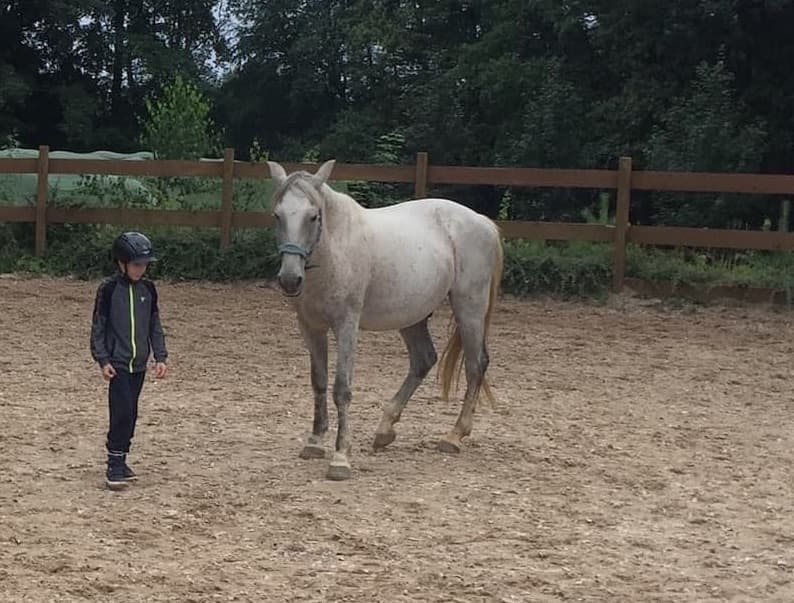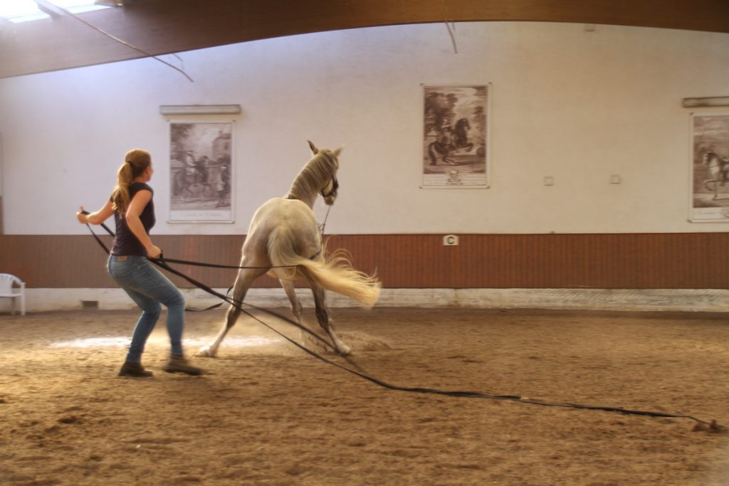 Als nächstes trat ein misshandelter Lusitano-Mix namens Grey aus Spanien, in mein Leben. Neben der psychischen Ausbildung, war bei Grey auch die physische Korrektur notwendig. An Reiten war lange nicht zu denken, erst mussten Körper und Muskulatur auf das Reitergewicht vorbereitet werden. Um diese Aufgabe meistern zu können, habe ich mich zusätzlich mit der akademischen Reitkunst nach Bent Branderup beschäftigt und Unterricht in gymnastizierender Bodenarbeit am Kappzaum bei Ursula Ursprung genommen.